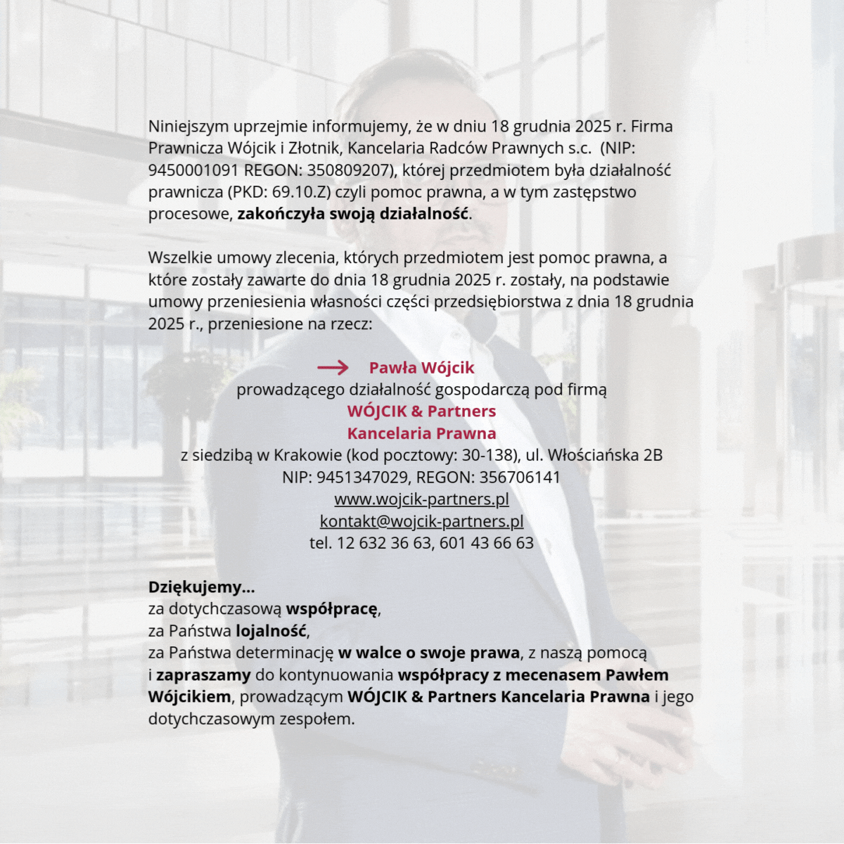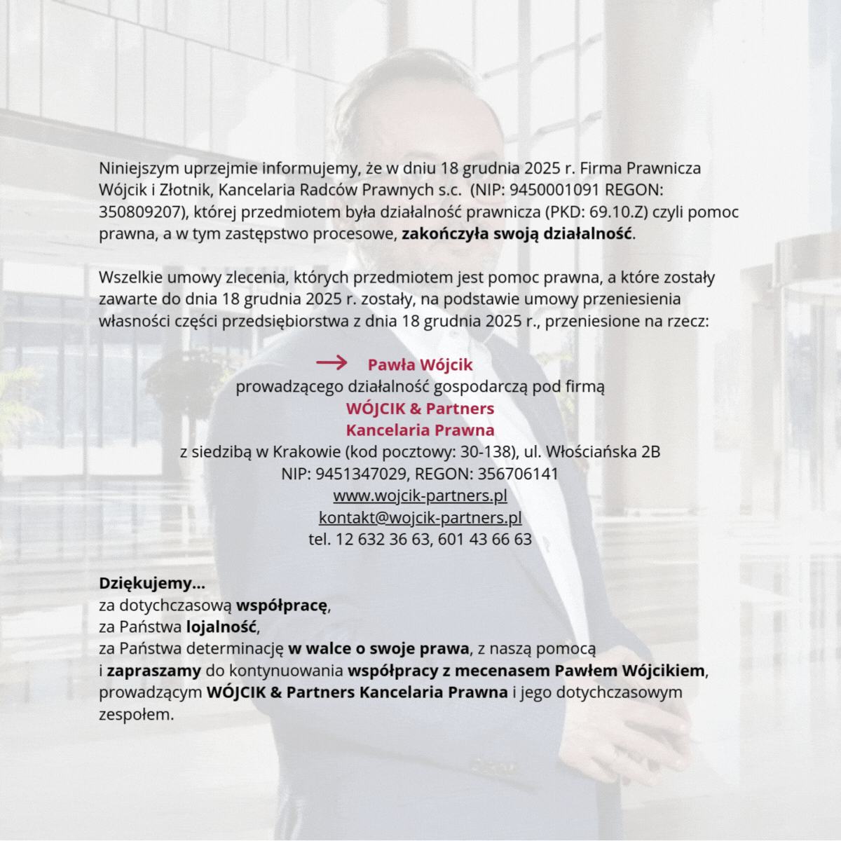 - wspólnik i współzałożyciel Firmy Prawniczej Wójcik i Złotnik s.c.